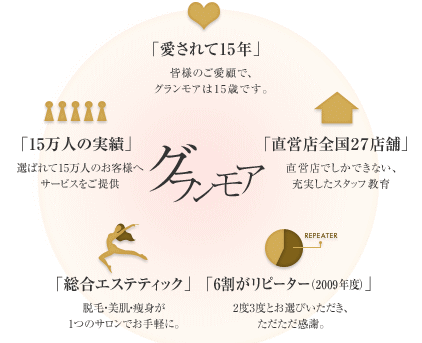 グランモアは、創業15年の実績があり全国に27店舗の直営店がある脱毛サロンです。